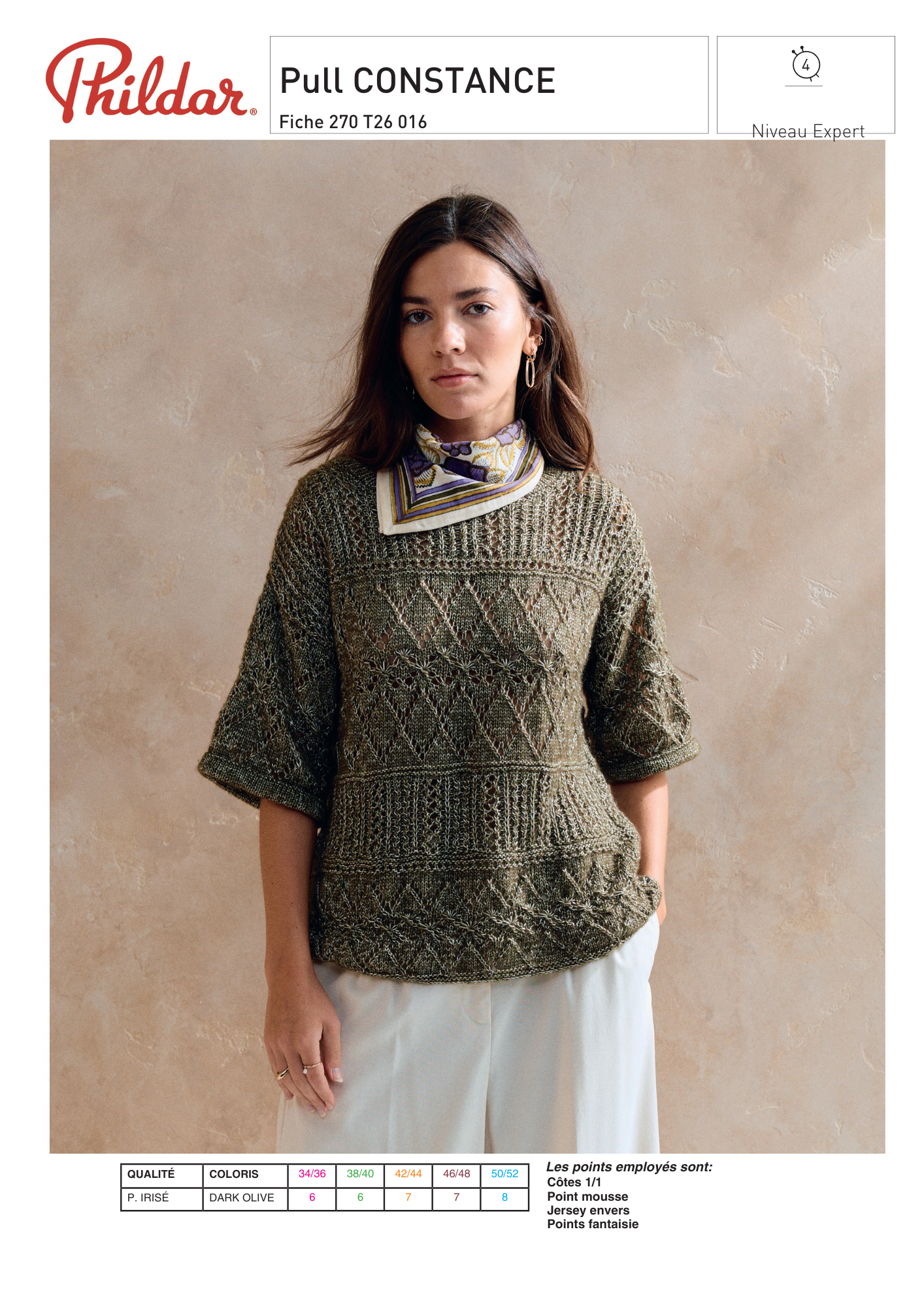 Riche en détails avec ses différents points fantaisie, ce pull Constance se tricote avec le Phil Irisé.