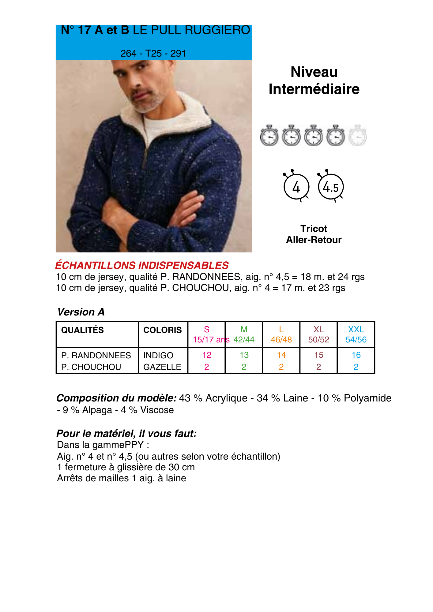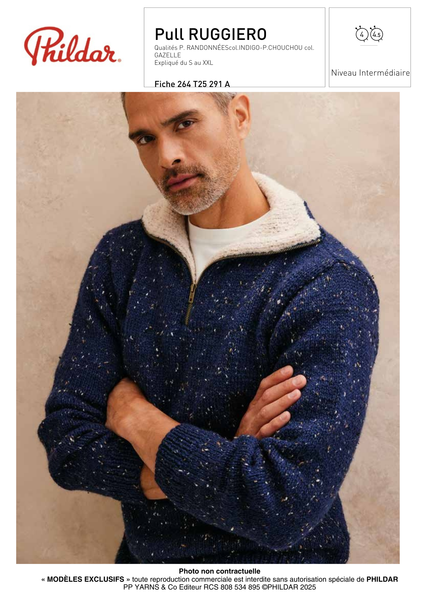 Idéal pour un look casual, le pull RUGGIERO séduit par son col zippé qui lui apporte une touche moderne et sportive. Tricoté de bas en haut en plusieurs morceaux qui seront ensuite assemblés, il constitue un projet accessible et agréable à réaliser. À la fois pratique et élégant, ce modèle deviendra sans aucun doute un superbe ajout à votre garde-robe, parfait pour les journées fraîches.