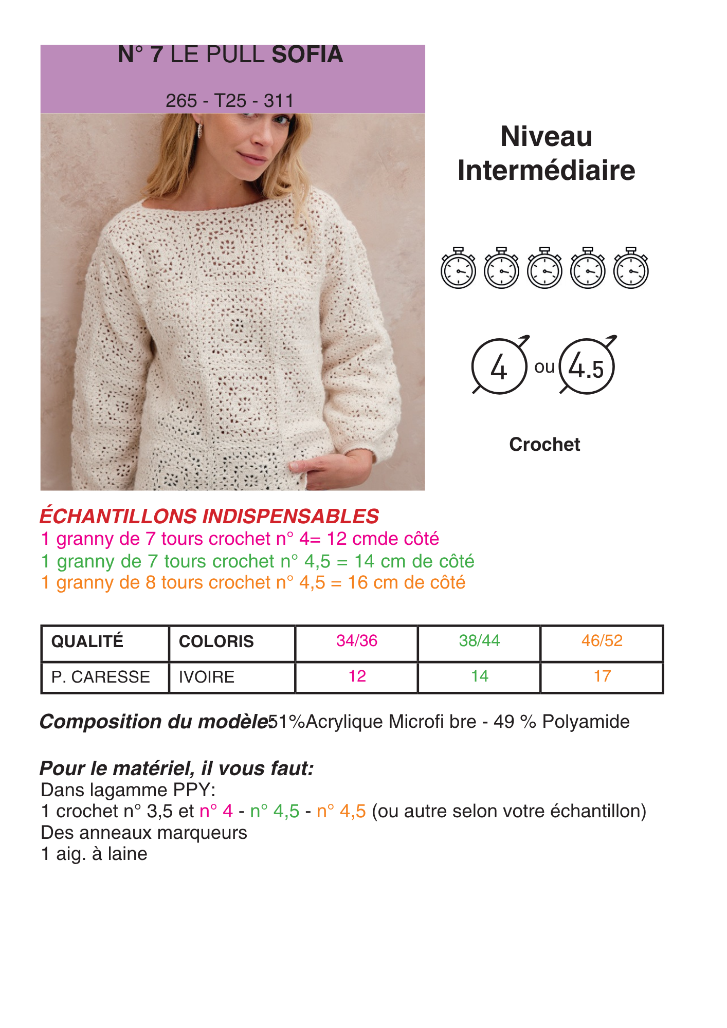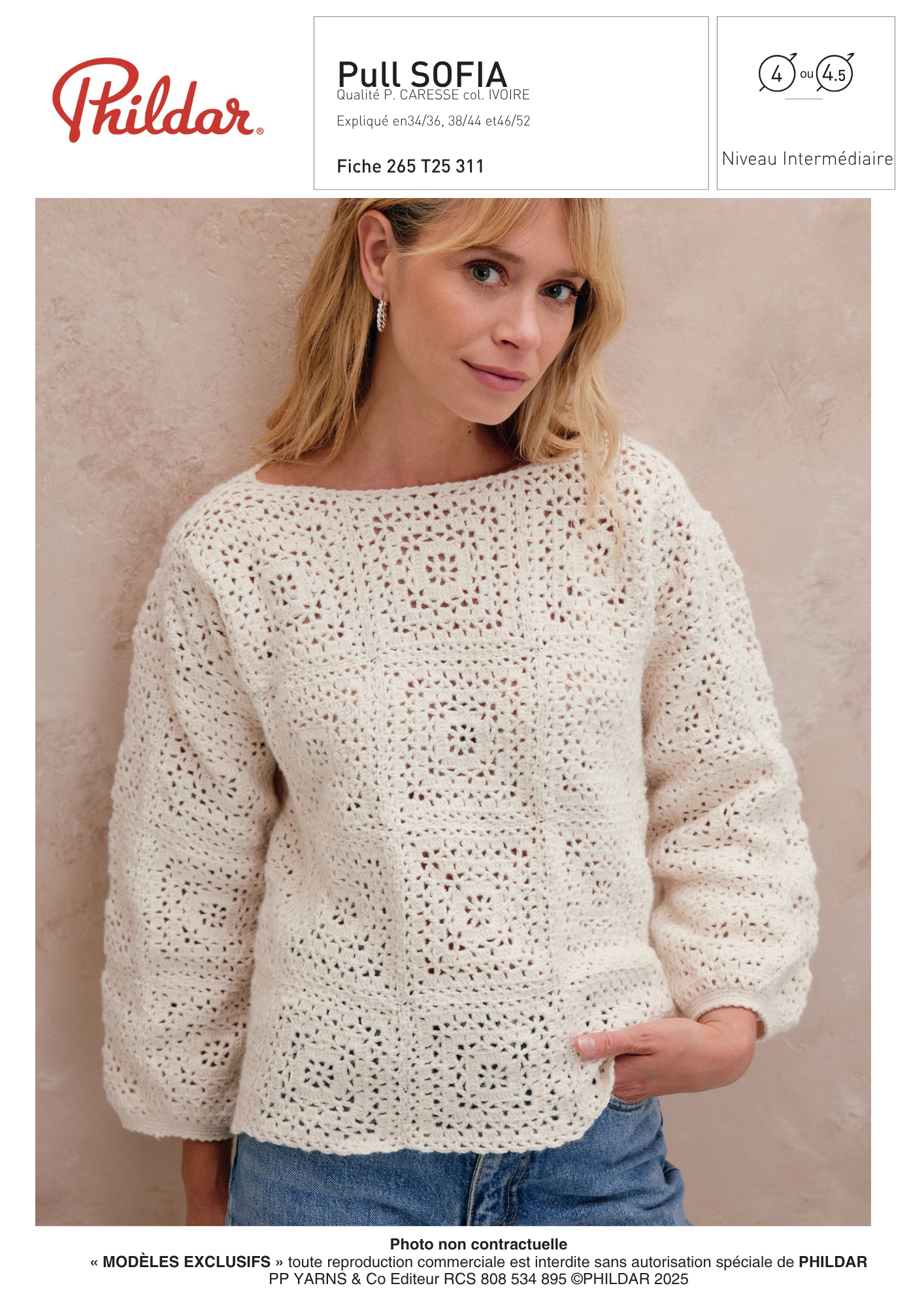 Craquez pour ce pull SOFIA et ses jolis motifs granny, crocheté en P. CARESSE.