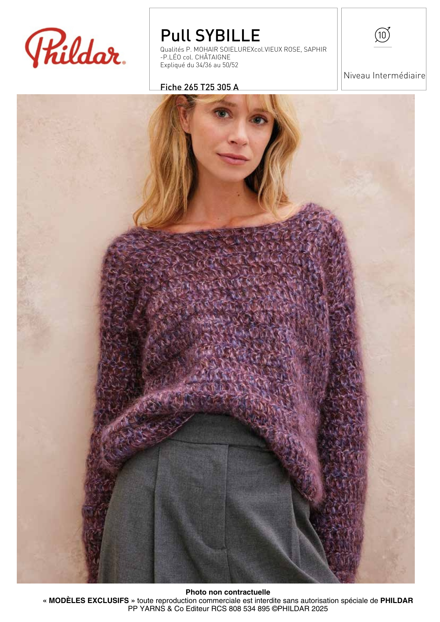 Crocheté avec 3 fils pour un effet unique, ce pull SYBILLE se réalise en P. MOHAIR SOIE LUREX et P. LÉO. (ou P.CHIC LUREX)
