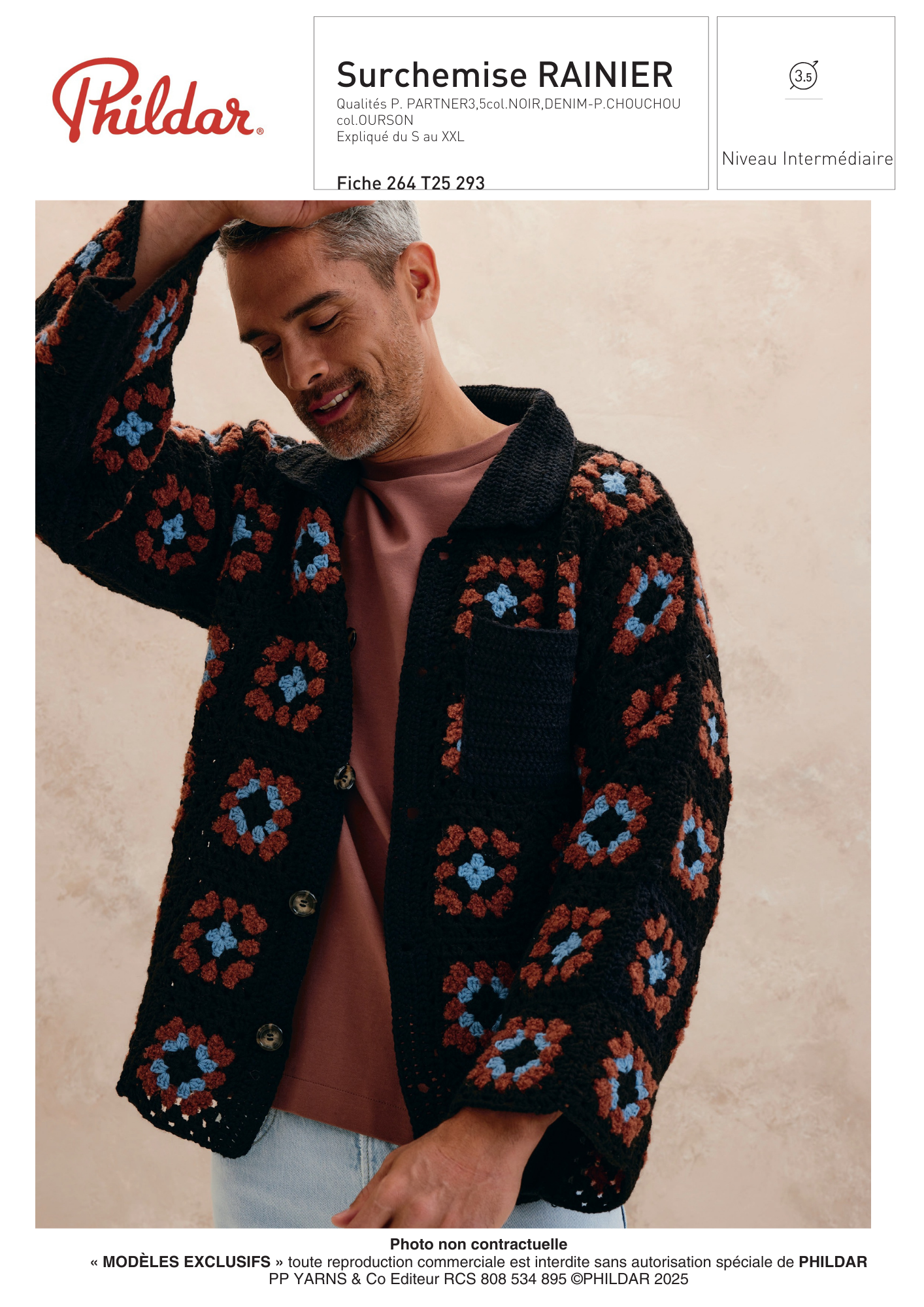 Tendance et originale, la surchemise RAINIER se crochète en granny squares pour un style unique et plein de caractère. Libre à vous de jouer avec les couleurs : optez pour une palette classique et masculine, osez des teintes vives et éclatantes qui attirent le regard, ou choisissez un monochrome sobre et élégant. Polyvalente et créative, cette pièce vous offre une infinité de possibilités pour exprimer votre personnalité et apporter une touche distinctive à votre garde-robe.
