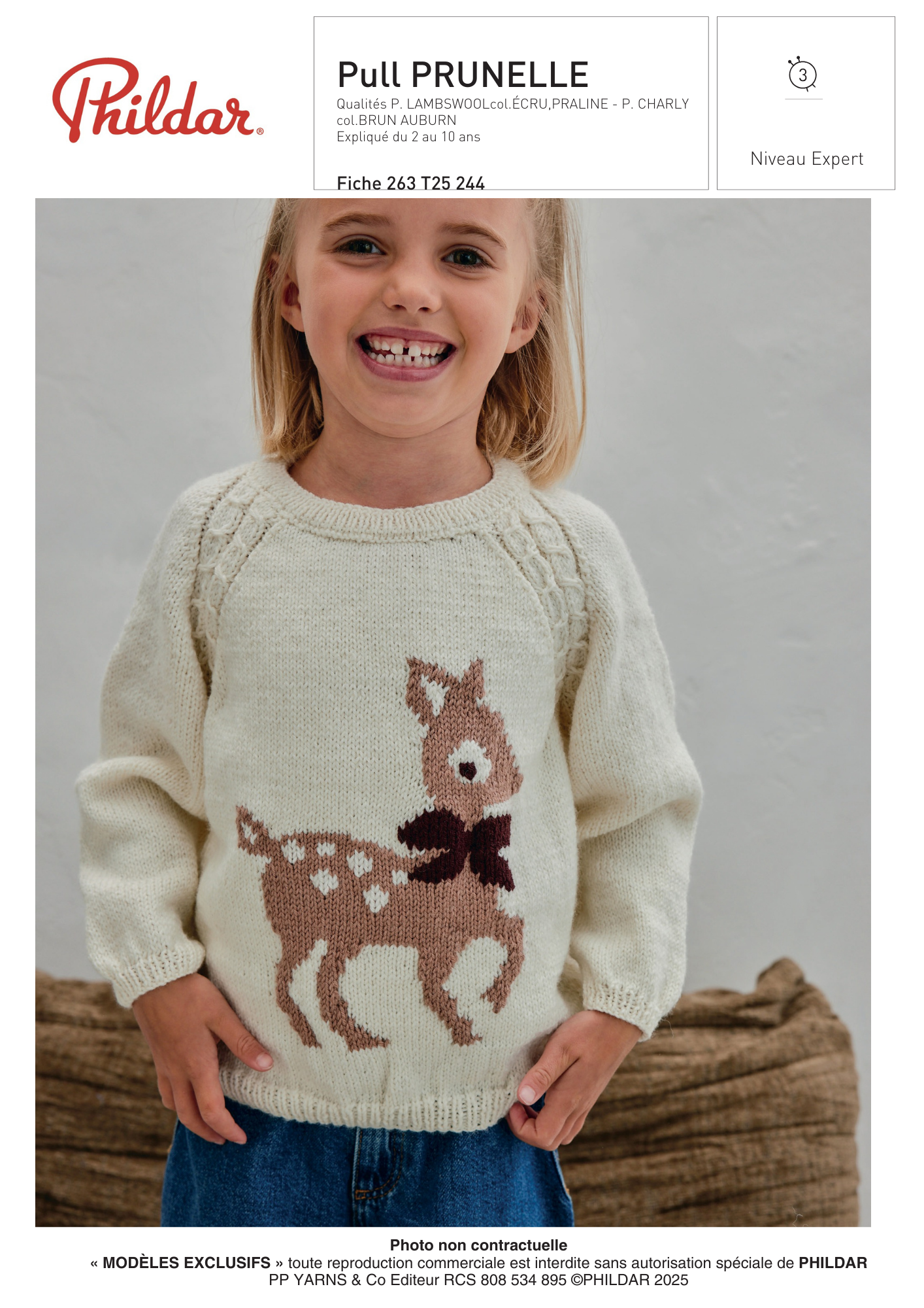 Modèle pull fille PRUNELLE, tricoté en Phil Lambswool, avec un motif jacquard en intarsia et de délicates torsades le long des raglans.